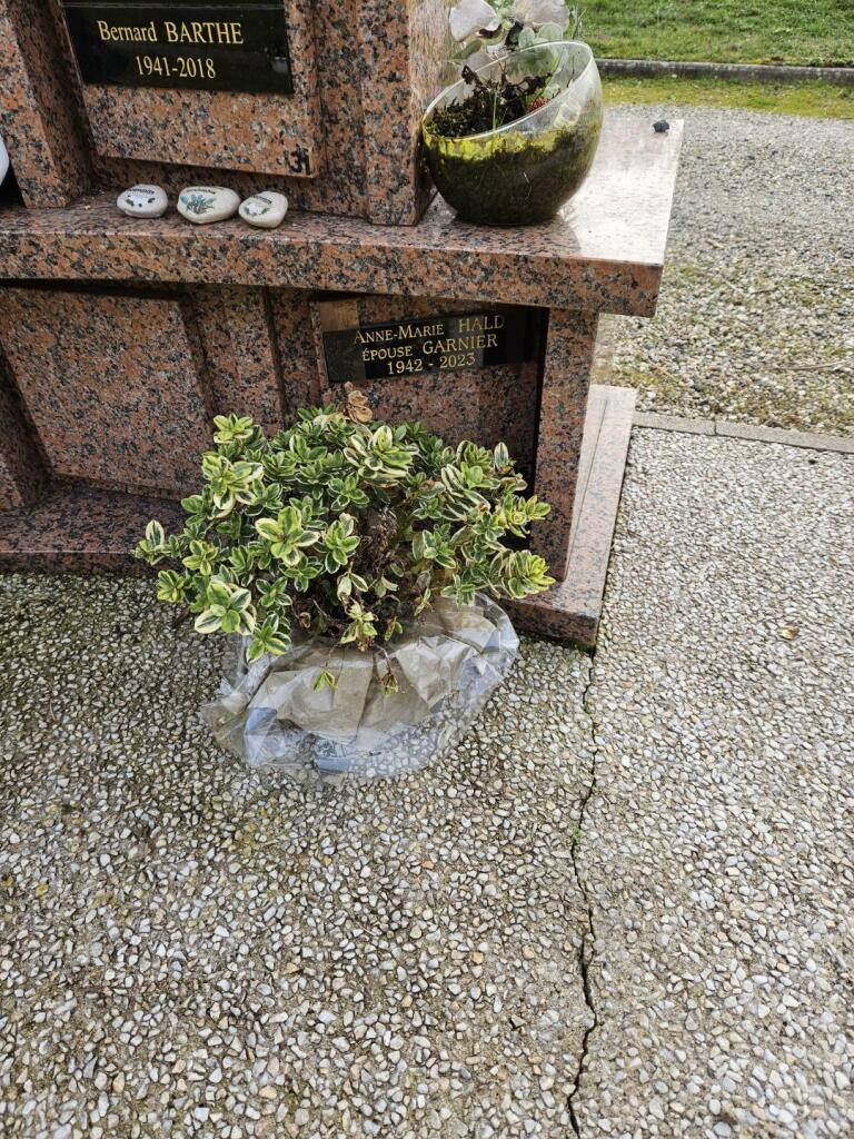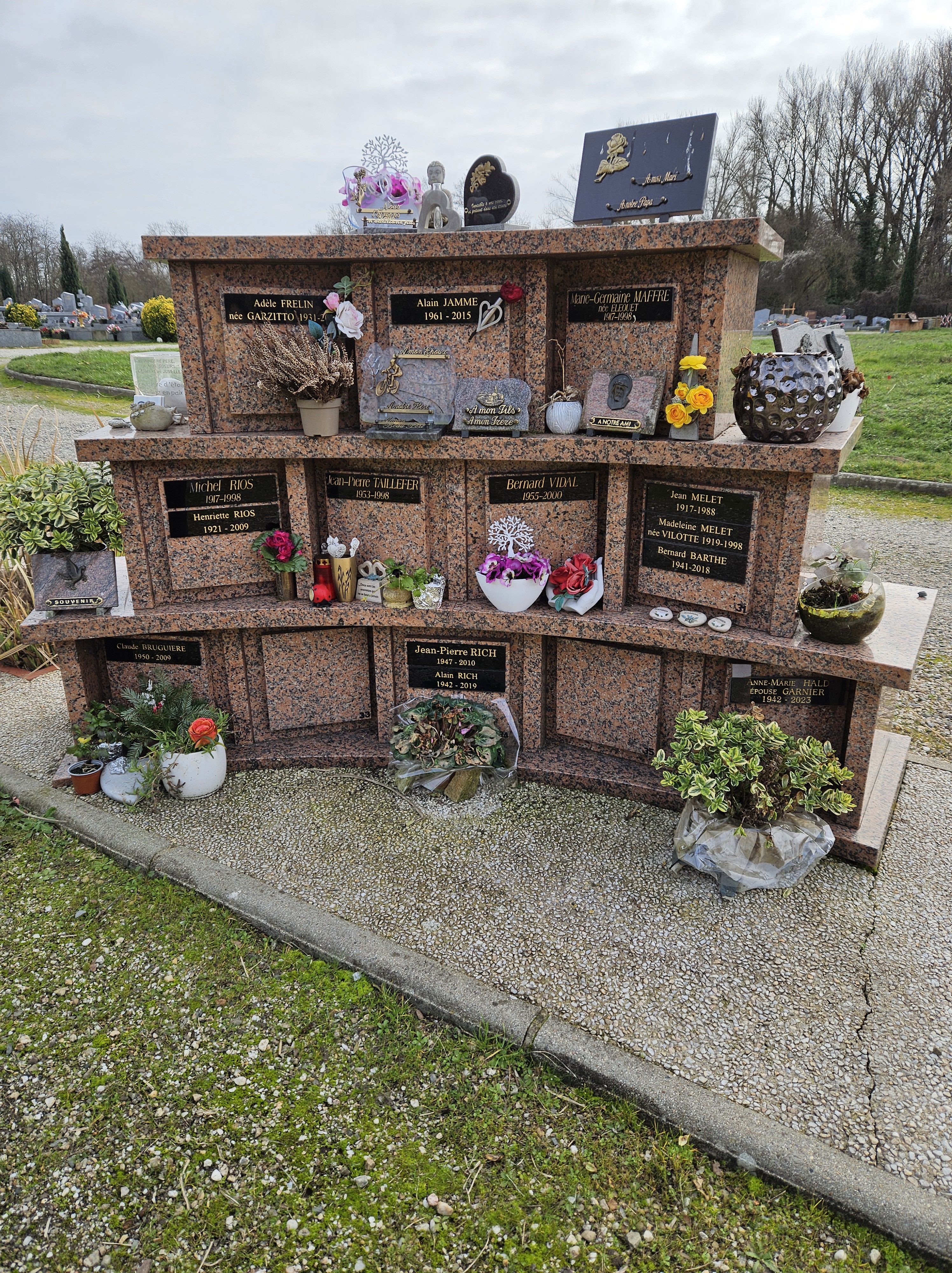 J’ai fait le choix de conserver les cendres d’Anne-Marie dans une urne en céramique pourpre (pas d’urne violette proposée au catalogue des pompes funèbres !), déposée dans un colombarium. Celui du cimetière de Caussels (8, route de Millau à Albi) est original avec plusieurs possibilités (mur, pyramides, emplacements au sol), dans un environnement dégagé, dans la verdure.
